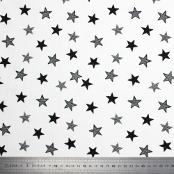 Le jersey "étoiles" blanc cassé et noir est un tissu doux, souple et extensible. Ce tissu est vendu par 10 cm (voir les exemples ci-dessous). La longueur achetée vous sera livrée d'un seul tenant.