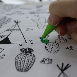 Le tissu à colorier miam en coton peut être personnalisé avec des feutres pour tissu à fixer au fer à repasser ou avec des feutres lavables.